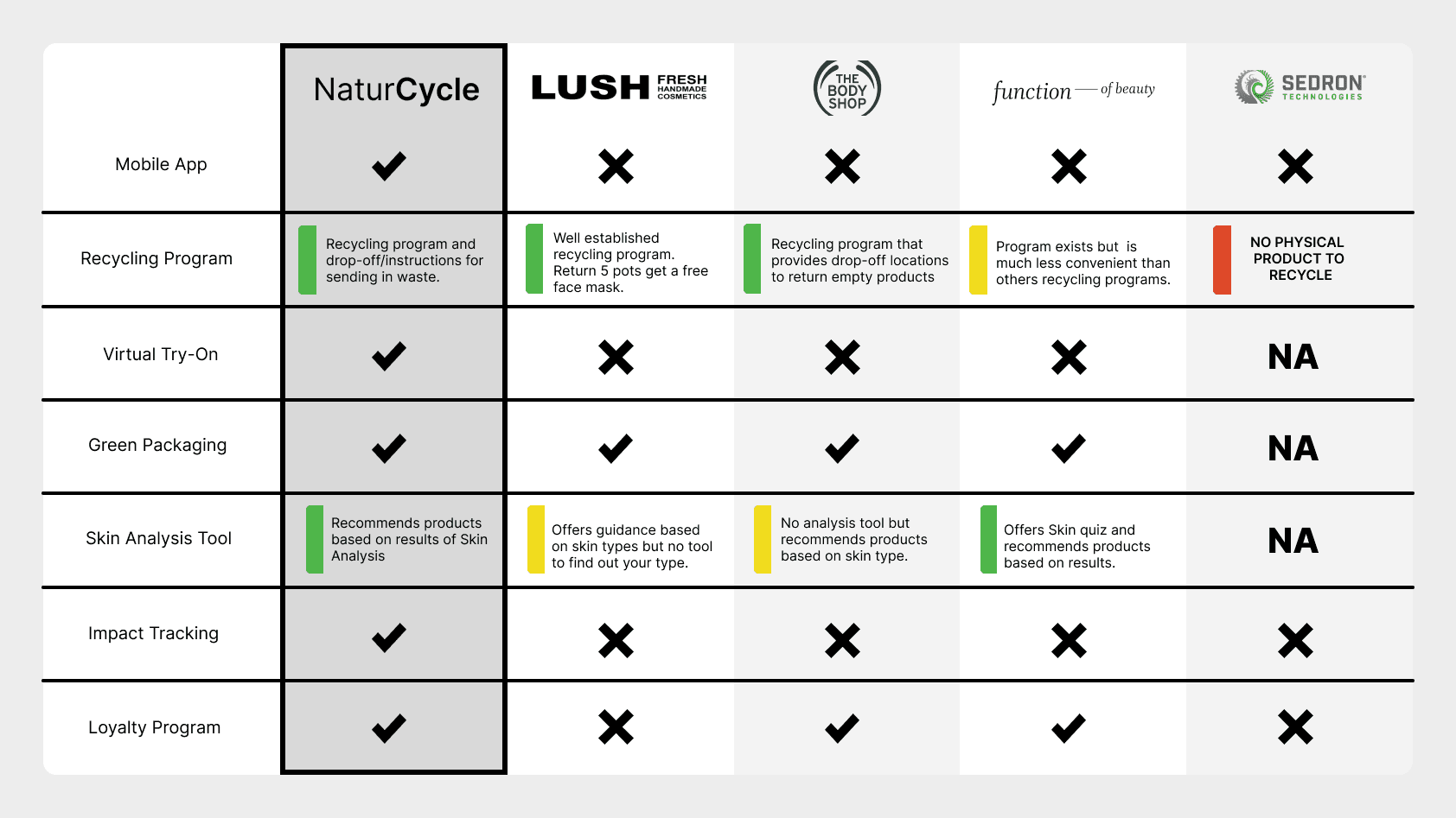 NaturCycle's biggest stand-out factors compared to its competitors are its virtual try-on feature, donation impact tracking, and skin analysis tool.stand-out