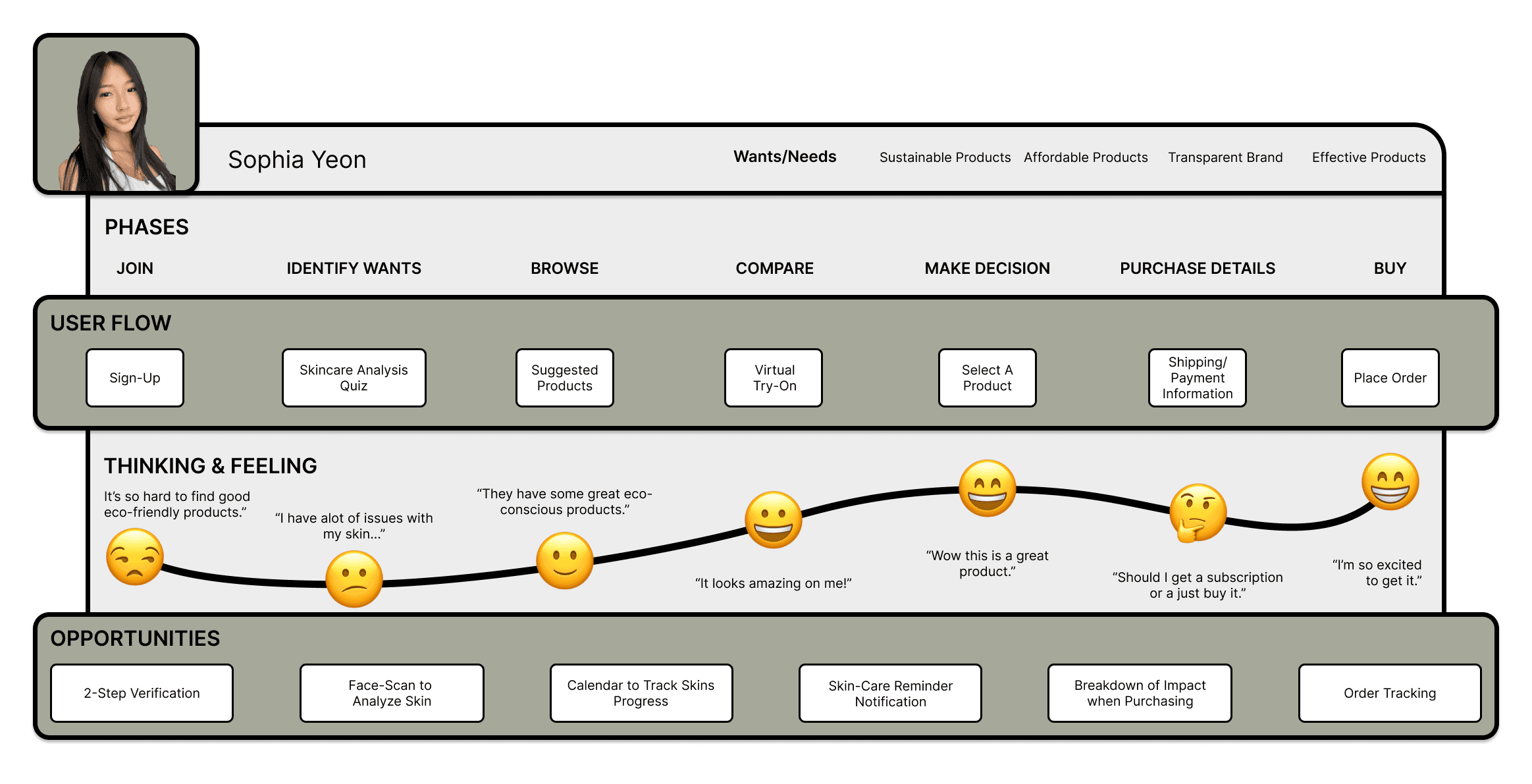 After Validating my flow, I journey mapped Sophia Yeon, my qualitative personas, trip through the flow all the way from joining the app to making her first purchase