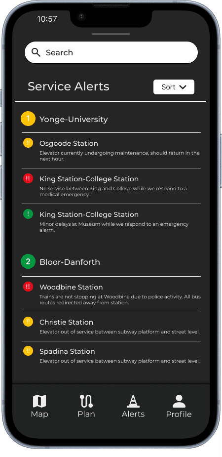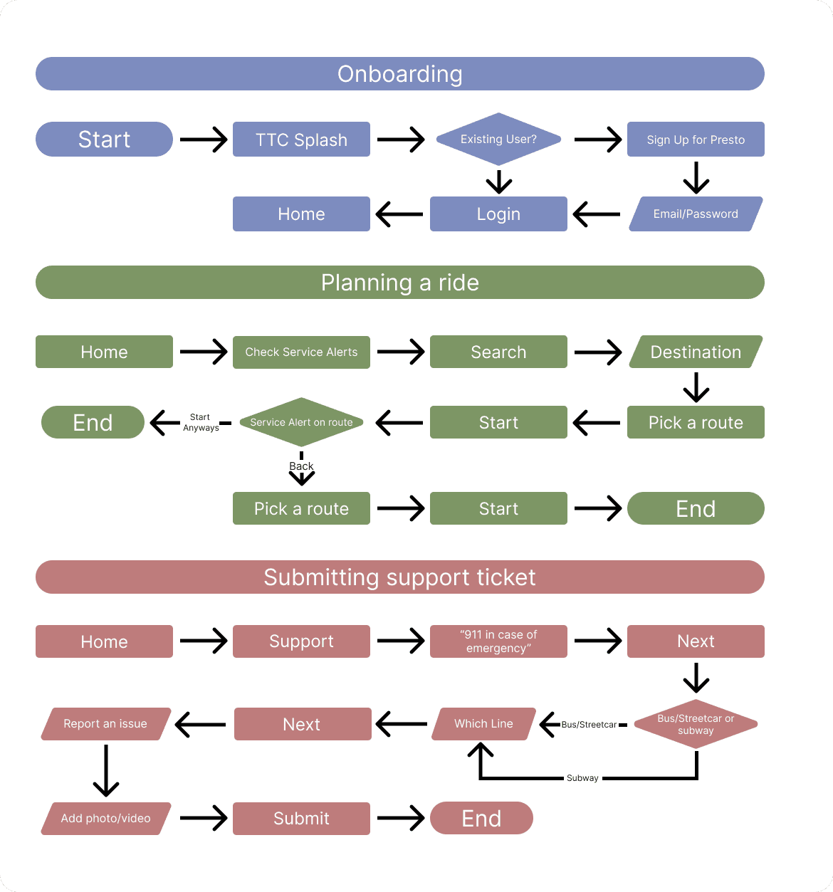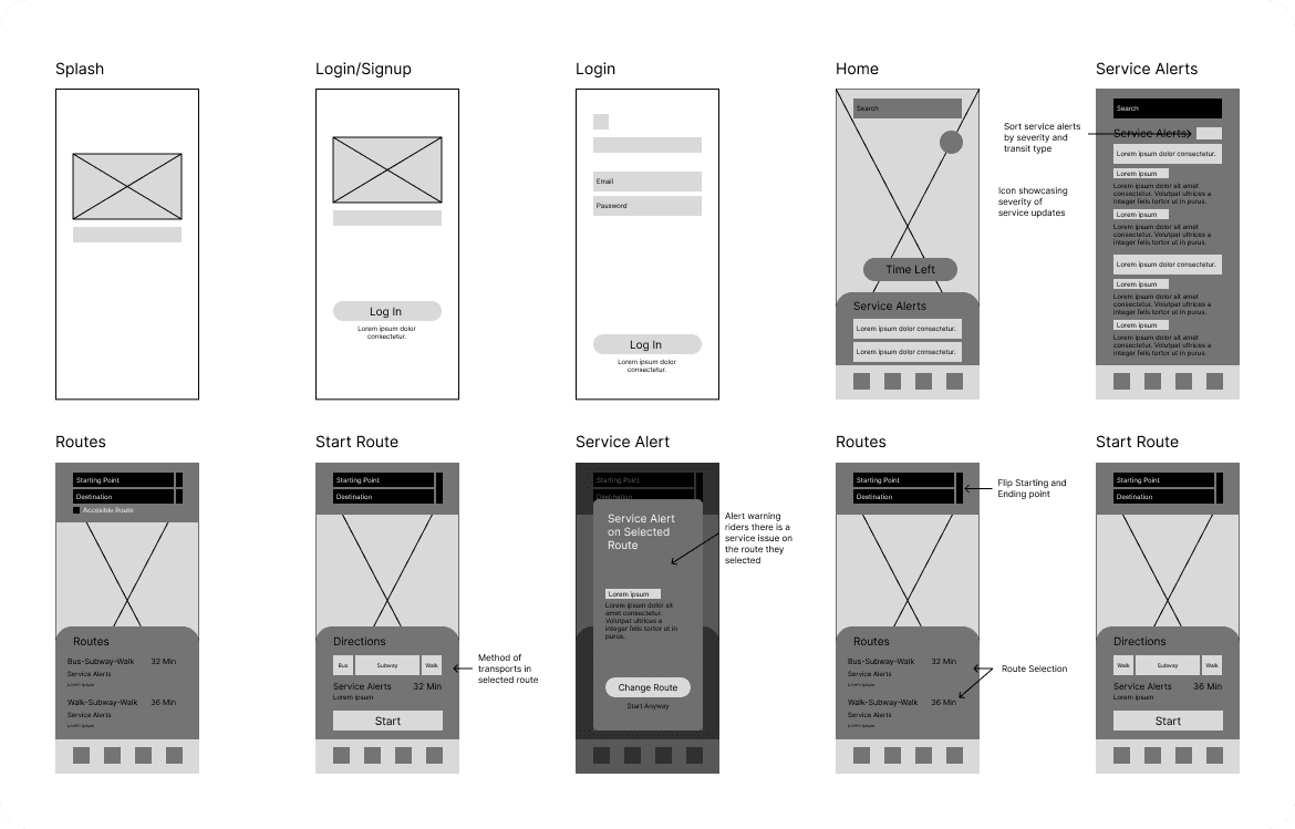 I tackled three different flows for this project. Onboarding and signing up for the app, Checking service alerts and planning a ride, and submitting a suuport ticket.