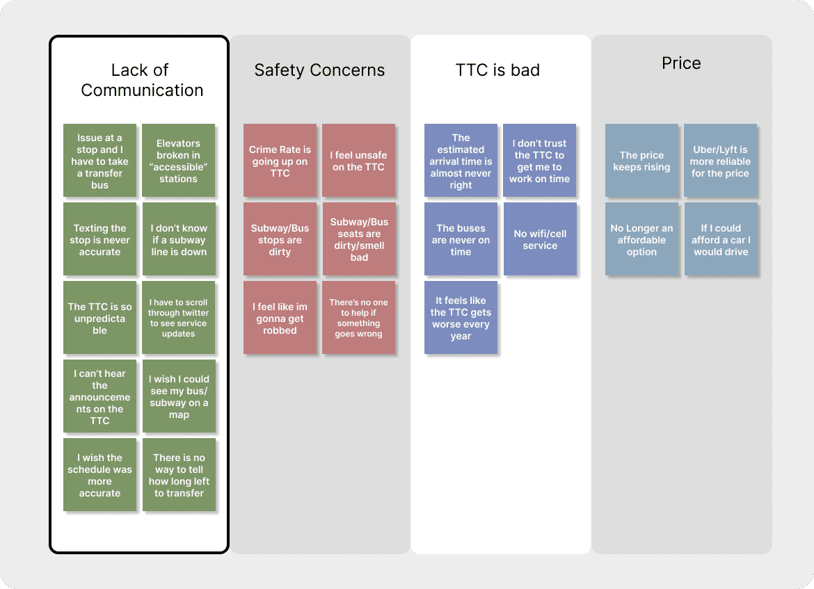 Some key interview findings were how fed up daily TTC commuters were with the current state of the TTC and how Uber/Lift and Car commuters would be willing to take public transit if the system improved.